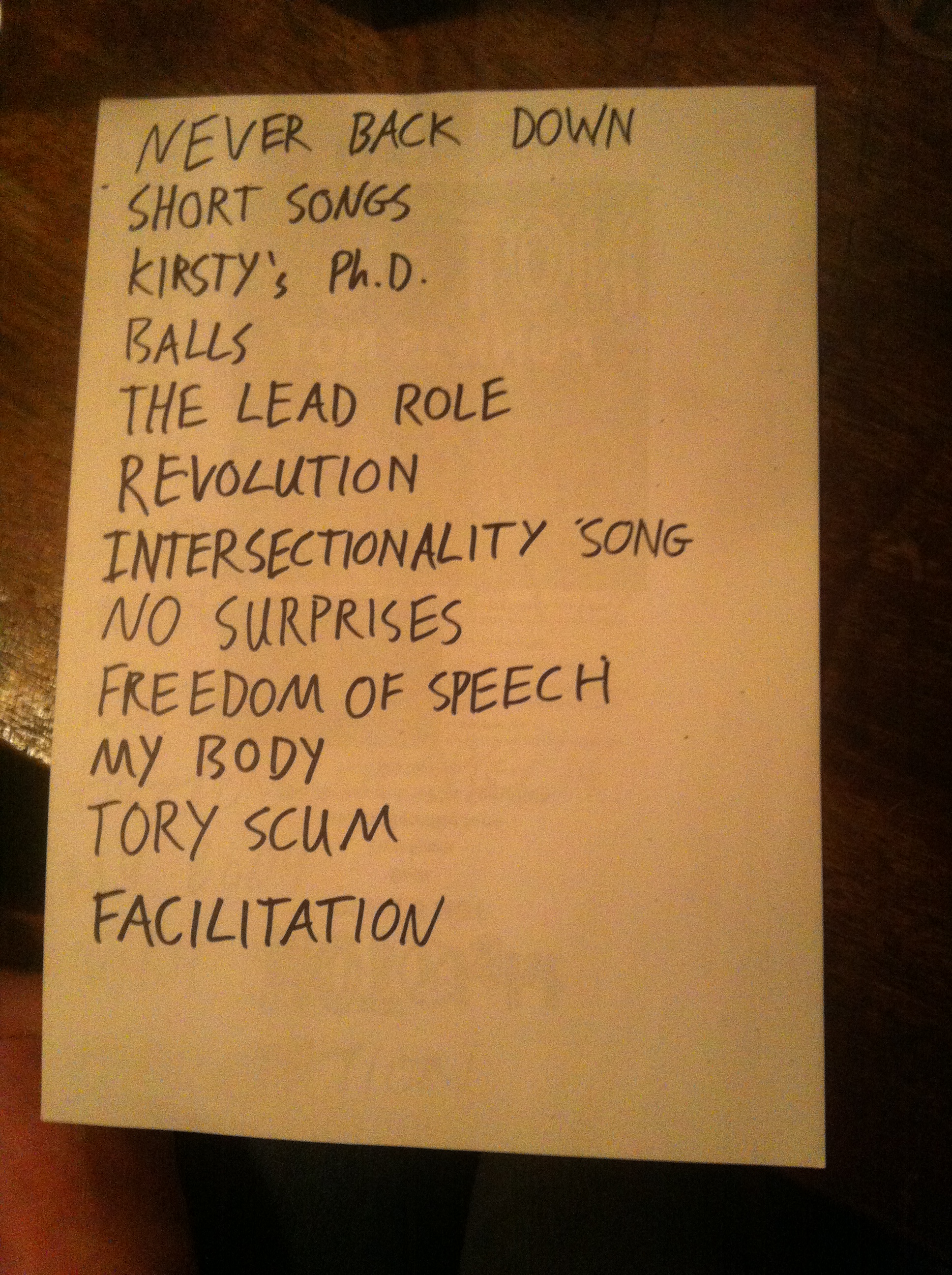 “Short Songs” originally by the Dead Kennedys. “No Surprises” originally by Radiohead.
